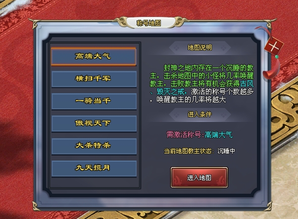激活对应称号可以进入封神地图,封神之地内存在一个沉睡的教主,击杀地图中的小怪将唤醒教主,击败教主将有机会获得古风,毁灭之戒,激活的称号个数越多,唤醒教主的几率将越大。