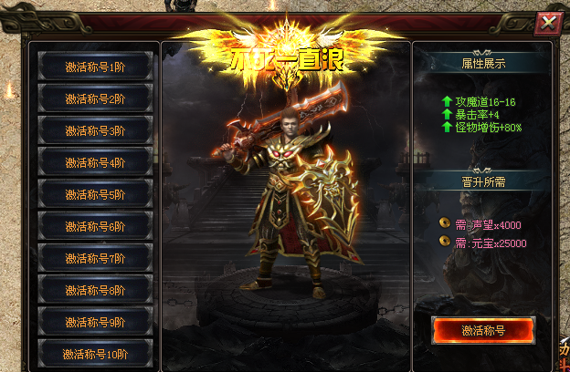 称号系统可获取炫酷称号,并获取对应的属性增幅,提升人物攻魔道,暴击率,怪物增伤等。